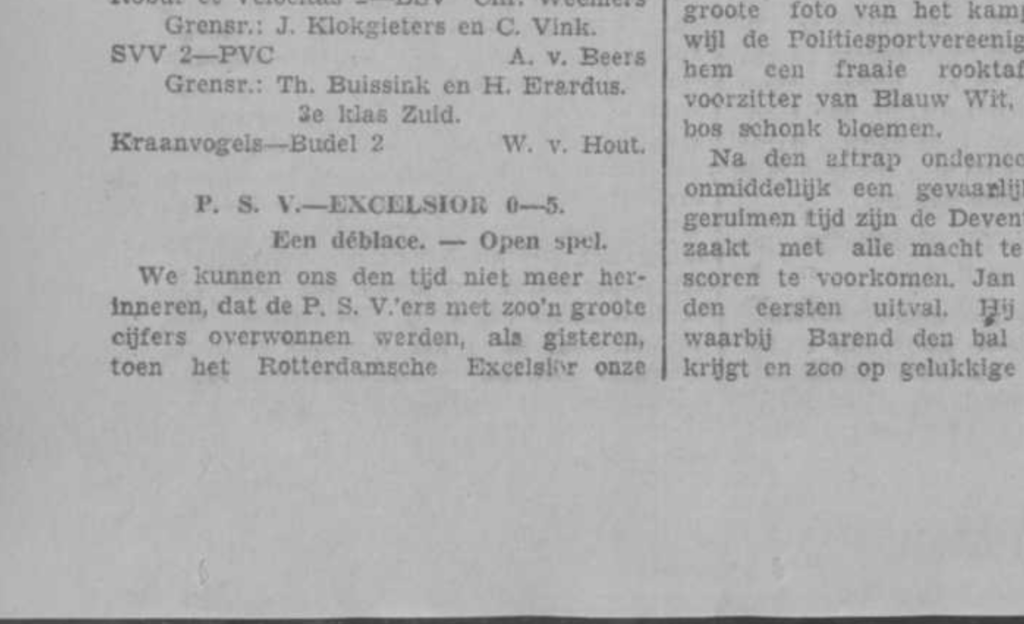 ‘We kunnen ons den tijd niet meer herinneren, dat de P.S.V.’ers met zoo’n groote cijfers overwonnen werden, als gisteren, toen het Rotterdamsche Excelsior onze rood-witte stadgenooten een formidabel pak voetbalslaag heeft toegediend”, schreef het Eindhovensch Dagblad de dag na de kwartfinale van de Holdertbeker tussen PSV en Excelsior op 29 mei 1930. Excelsior, dat onderaan meedeed in de eerste klasse West I, plaatste zich uiteindelijk voor de enige finale in de clubgeschiedenis, waarin Feyenoord met 1-0 te sterk was.