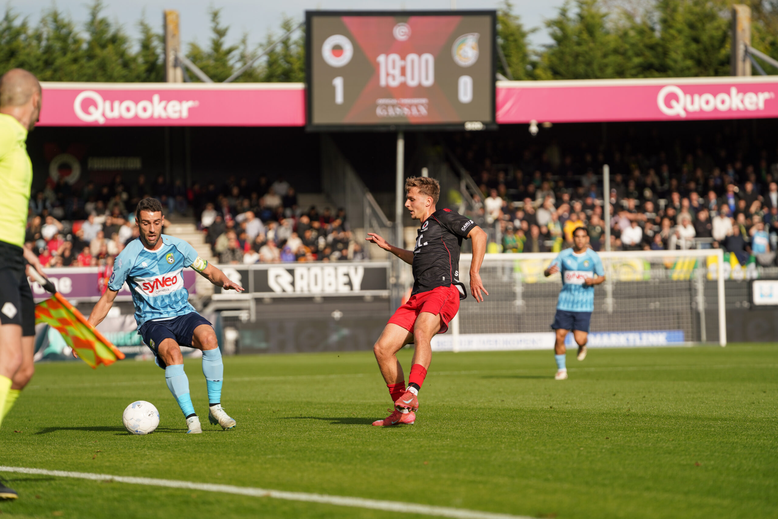 Met Stefan Mitrovic en Chris-Kévin Nadje in plaats van Derensili Sanches Fernandes (bank) en Noah Naujoks (afwezig) begon Excelsior de zonnige herfstmiddag voortvarend. In een snelle counter bereikte Irakli Yegoian met een messcherpe voorzet Gyan de Regt. Die stond dicht bij de keeper, waagde het er maar op en maakte met een omhaal de schitterende 1-0.
